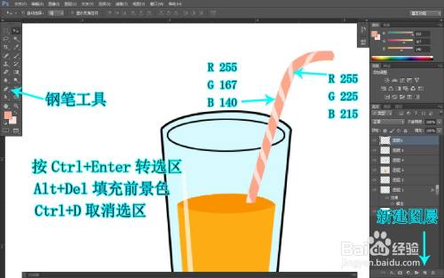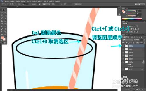 用钢笔工具绘制吸管,建图层,填充颜色,将黑色椭圆框的图层移至最上方,使用钢笔工具绘制吸管和黑框交叉处的路径,Ctrl+Enter转为选区,删除吸管图层的颜色,按Ctrl+D取消选区