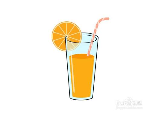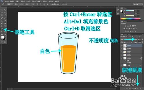 钢笔工具绘制橙汁的路径,新建图层,填充颜色,按Ctrl+D取消选区,再使用钢笔工具绘制杯子的高亮区域,填充白色,调整图层不透明度