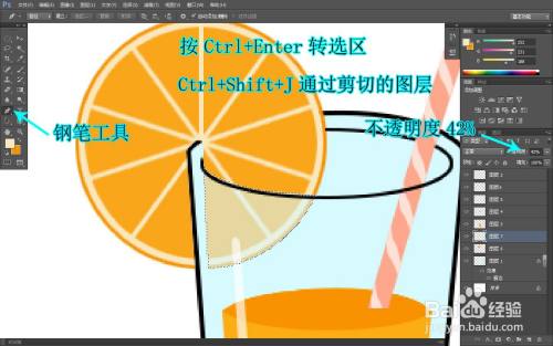 将橙子右下和杯子交叉区域用钢笔绘制路径,转选区后按Ctrl+Shift+J(通过剪切的图层),把选区内的橙子颜色分离成新图层的内容,将新图层的不透明度调小,这样就能做出杯子内的橙子颜色和杯子外的颜色不同的效果