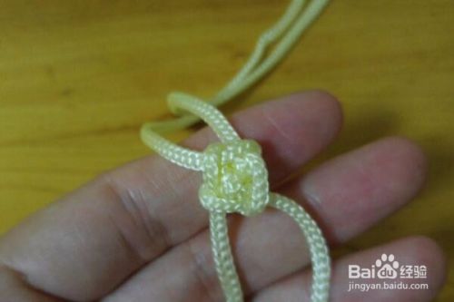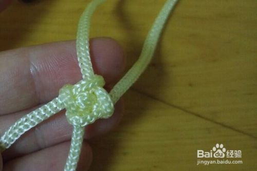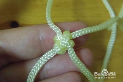然后按照绳子的走向,将4根绳子进行收紧并且进行调整,这样一个桂花结就编织好了。
