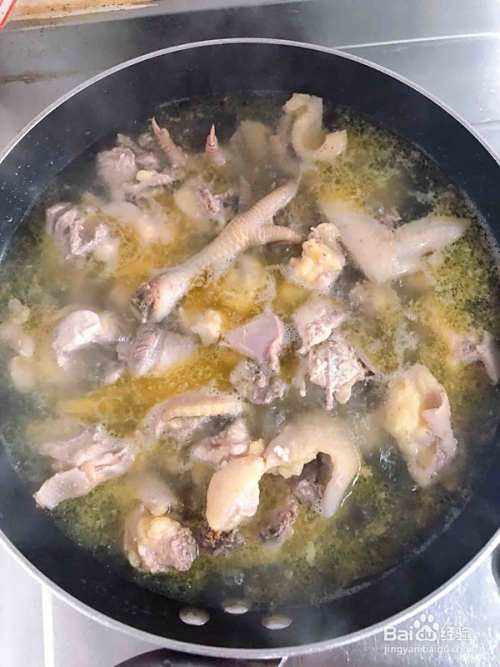 将全鸡剁成小块,在开水中焯一下,捞出待用。