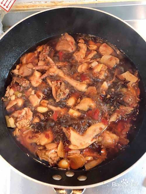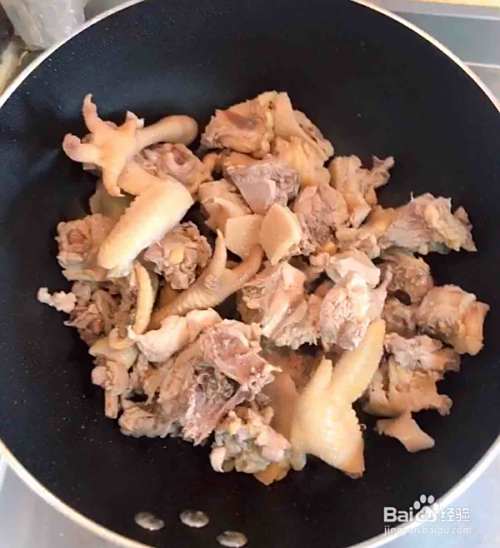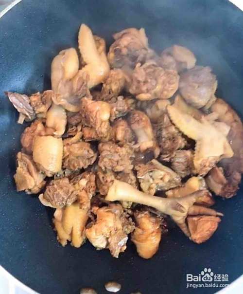 冰糖融化后,放入鸡块翻炒均匀。