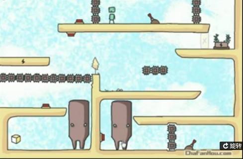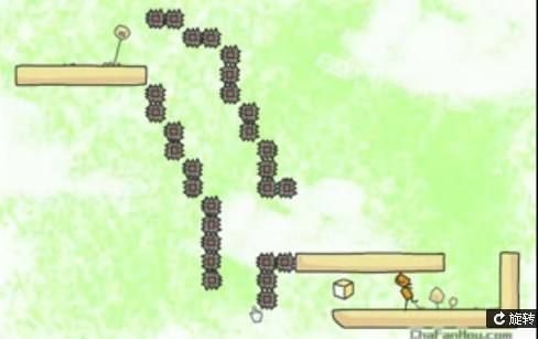 13第12关:这关奇难,需要的是连贯性,几乎是一气呵成,开始后往右边分个小人,小人开启机关后,原小人踩住最上方那个按纽,这样小人会去发电。当雷电板到达悬空刺柱偏左处时离开按纽,挡板打开小人通过雷电版到达右下角,雷电板往回转时,原小人跳上它并开启朝下按纽,然后跳到横刺柱右边的墙柱上。小人成功开启机关,横刺柱消失,在它将要消失时跳向下边那个按纽。小人时而打开、时而关闭最后一处机关,在未关闭机关的这段时间里原小人足以到达目的地。