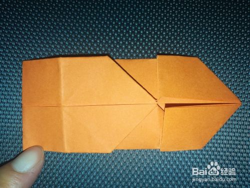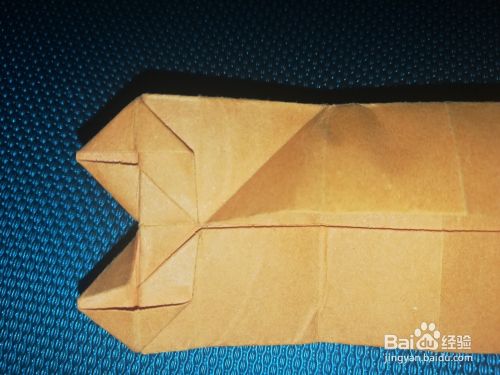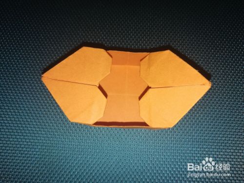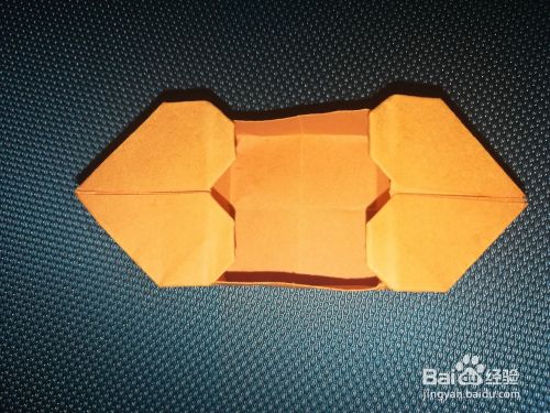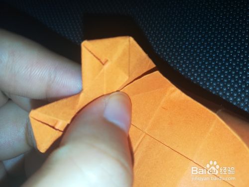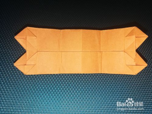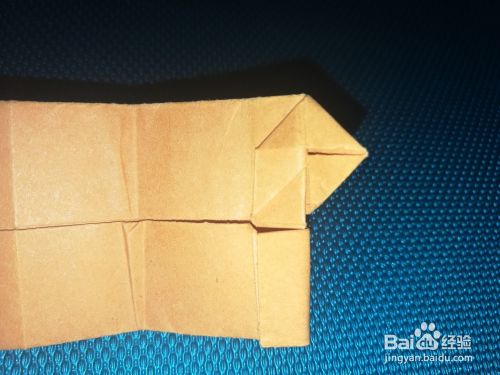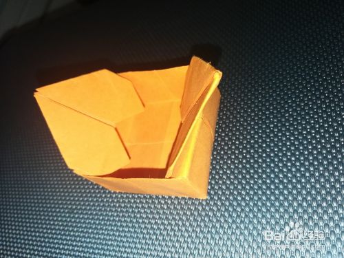 翻面,四个角处有四个长方形的形状,将其中一个长方形从纸缝中将其扩开,向上推开并向下压实,再将另一面的直角向内折,产生一个尖角。另三个长方形同样处理。