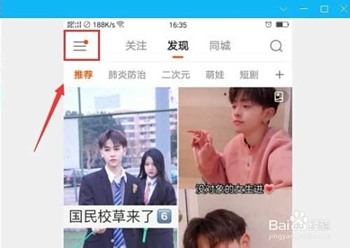 首先是打开快手,登录账号,点击上方的“三”横线,如下图所示: