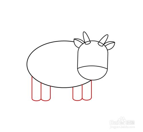 在头部内画出椭圆型的眼睛和鼻孔,四肢的末端画一根线条突出牛的蹄子,最后在牛屁股后方用两根弧线画出尾巴。
