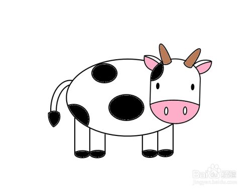 最后给奶牛上色时可以为其加上椭圆型的黑色斑纹,一只可爱的黑白花奶牛就完成了!