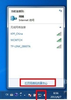 点击右下角电脑的小图标,再点击-打开网络和共享中心