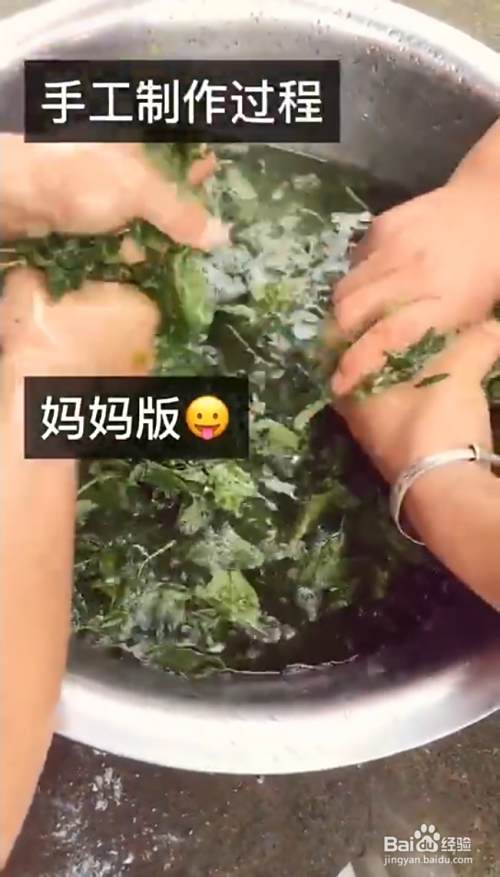 洗干净后,加点水用手搓烂或研磨器捣烂。(我们为了方便就直接上手啦!哈哈)