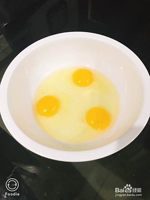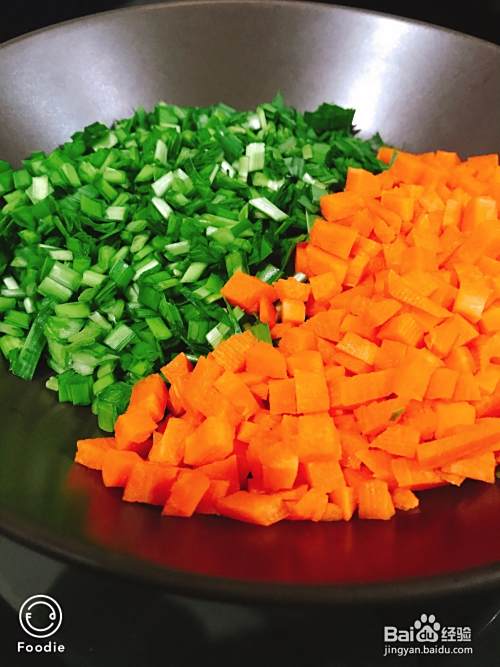 把韭菜、胡萝卜洗净,依次切好,放入盘中,胡萝卜尽量切的很小,打好三个鸡蛋备用。