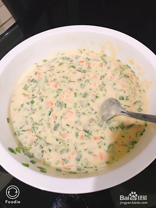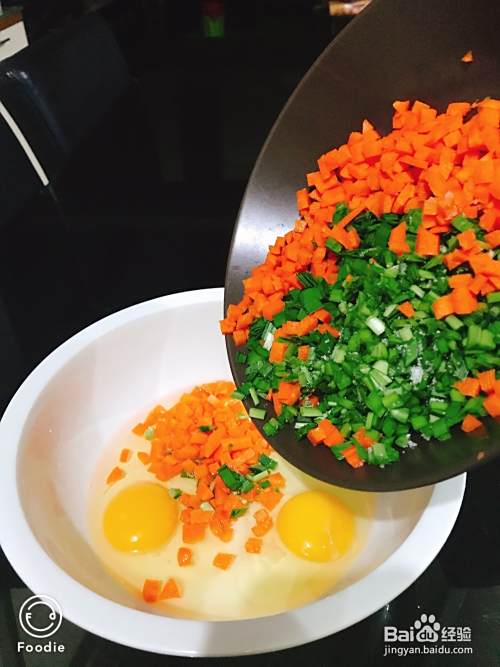 把鸡蛋和韭菜胡萝卜倒在一起,搅拌。