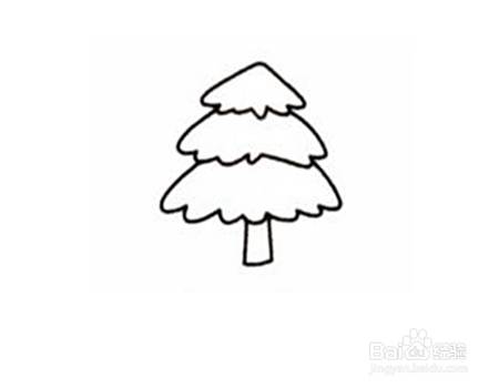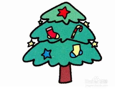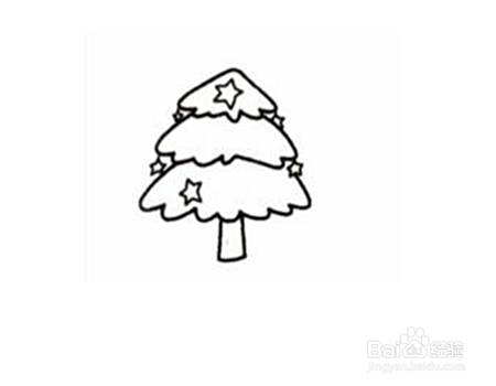 先画圣诞树的第一层,再画第二层,接着画第三层。再画出树桩,在圣诞树上面画一些装饰品,最后上颜色完成整个作品。