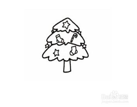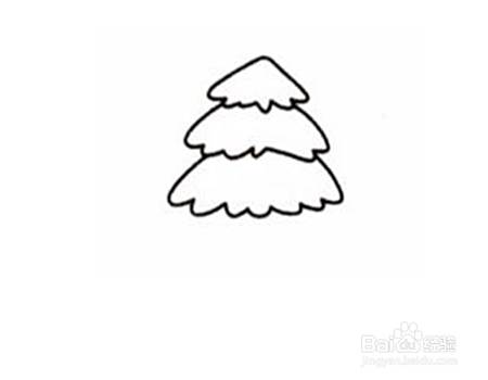 画这个圣诞树要注意层次感,上面的那一层要画得最小,要看起来有变化,树冠下面的弧线不要画得太规则,要有变化,而且每一层的变化都不要相同。