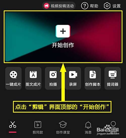 开始创作。点击“剪辑”界面顶部的“开始创作”。