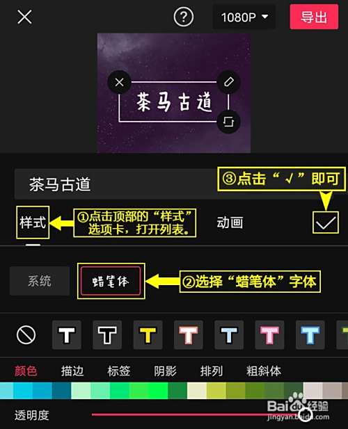 添加字体。点击顶部的“样式”选项卡,打开列表,选择“蜡笔体”字体,点击右上角的“√”即可。