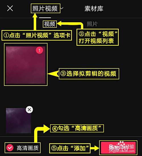 导入视频。点击“照片视频”选项卡,点击“视频”,打开视频列表,选择拟剪辑的视频,勾选“高清画质”,点击“添加”,导入视频。