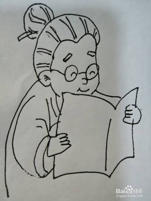 第七步,最后把看书的老奶奶的身体部分画完整。简笔画看书的老奶奶就画好了。