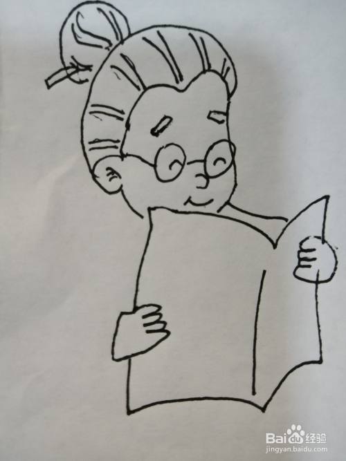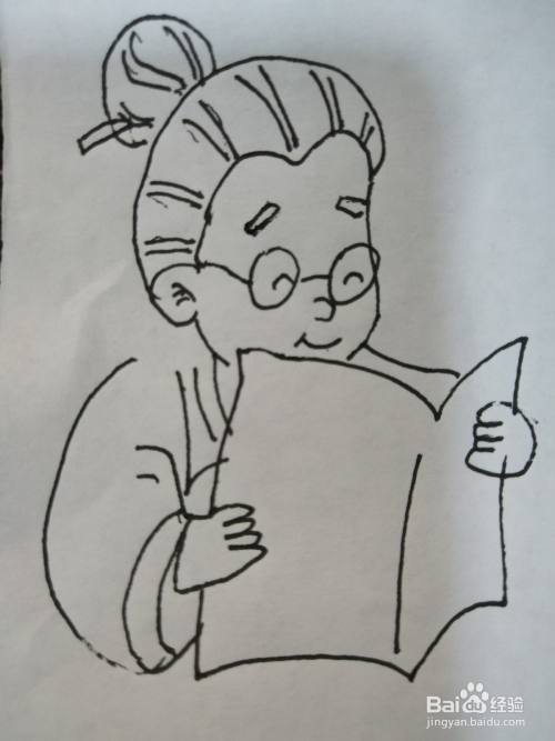 第六步,然后把看书的老奶奶手上的书本上的两只小手画出来。