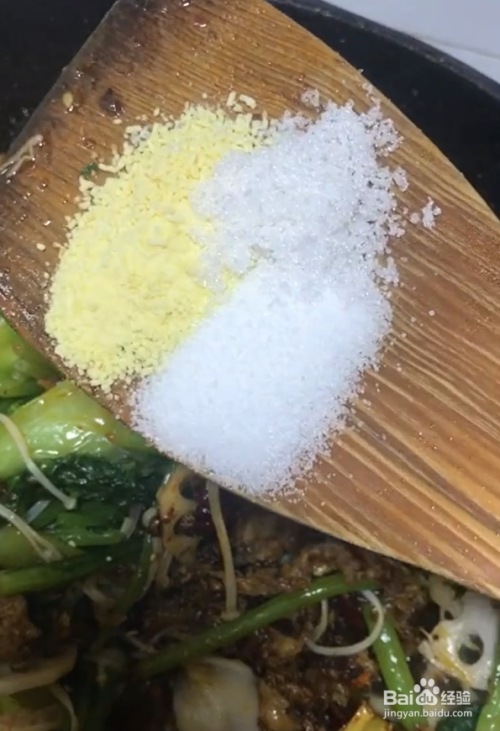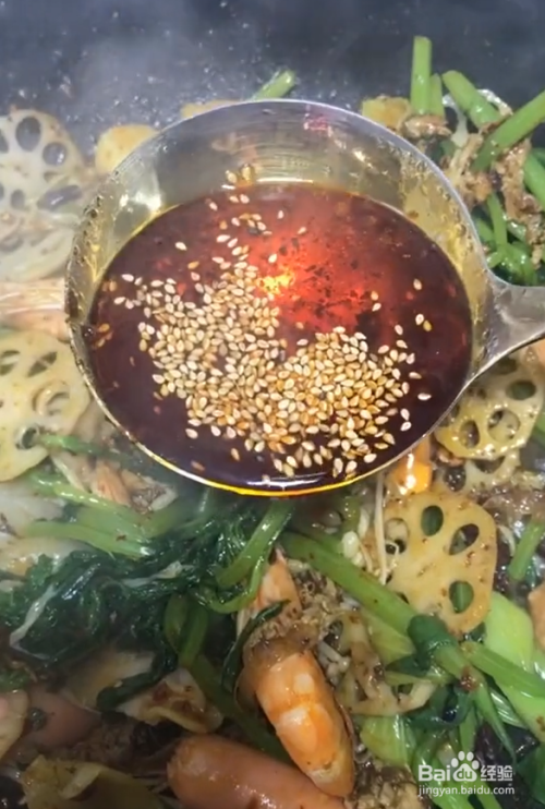下入配菜,翻炒几下,下入盐、鸡精、白糖,加辣椒油