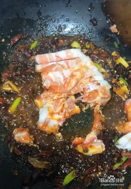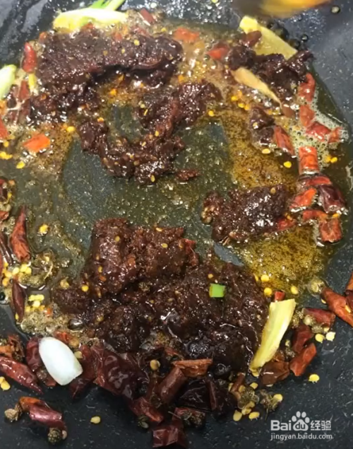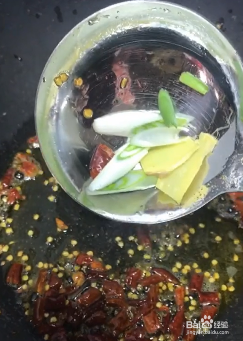 起锅烧油,下入花椒干辣椒炒香,再下入葱姜爆香