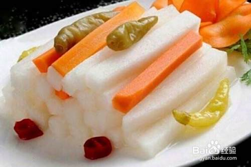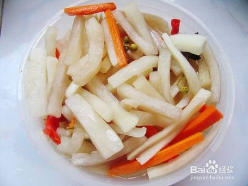 准备个干净无水无油的玻璃容器,里面加入适量的冰糖,米醋和凉白开,再用手摇晃瓶子,将这些调料混合均匀,再把姜片,泡椒和萝卜条放入容器中,再在上面撒上少许的花椒,最后将容器密封起来,腌制2个小时左右就可以吃了。