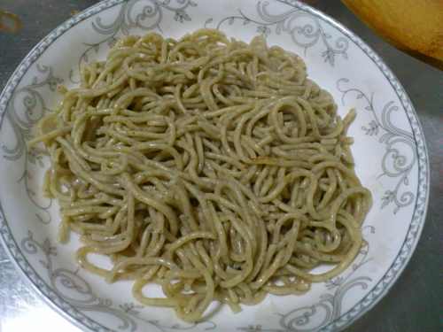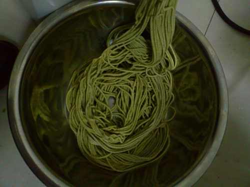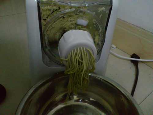将面粉、盐、鸡蛋、油和芹菜汁倒入面条机