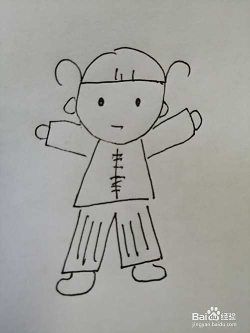 第六步,然后继续画出可爱的小女孩的裤子,注意裤子上竖条纹的画法。