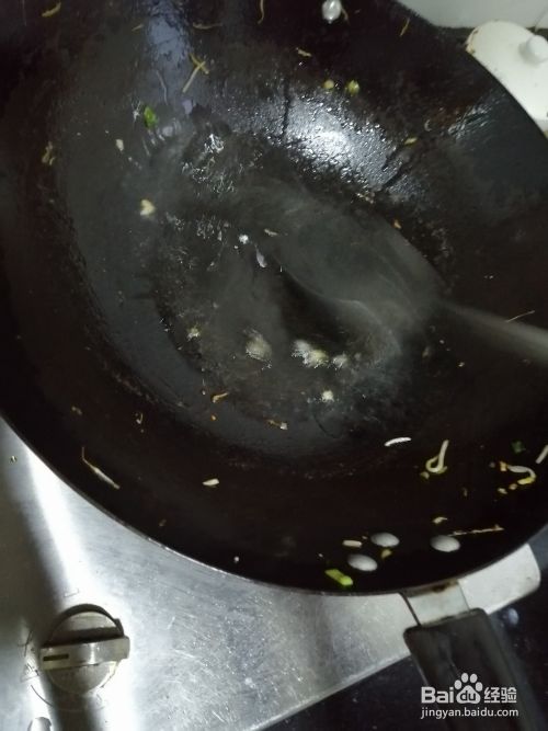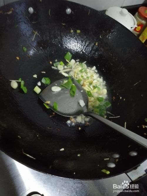 第三步,在铁锅中倒入适量的花生油,等油熟了以后倒入葱和生姜炒香。