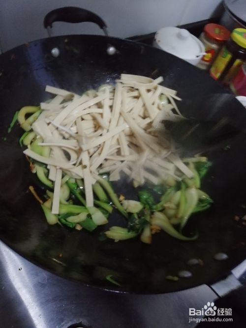 第四步,接着倒入准备号青菜和豆干一起翻炒入味。