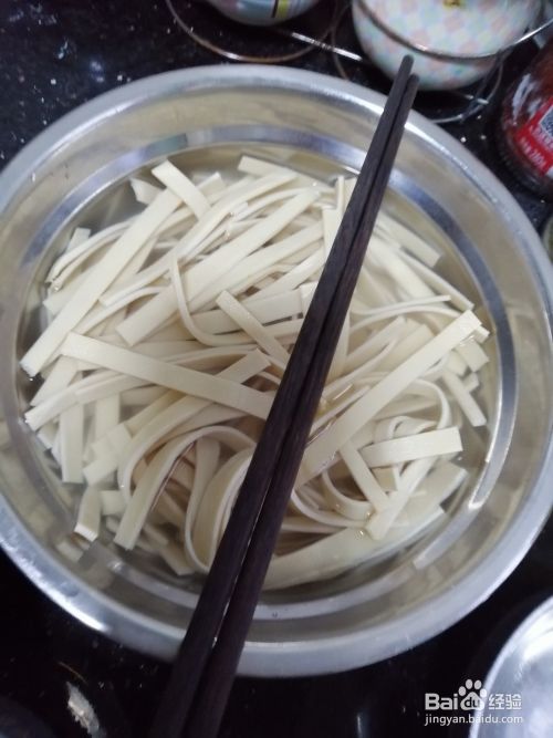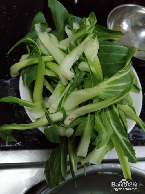 第二步,然后把青菜和豆干切成小块,把豆干泡入水中备用。