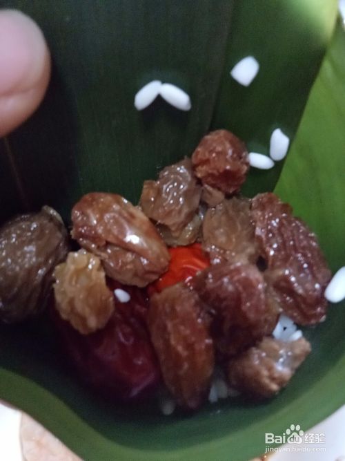 提前一天把葡萄干,红枣,糯米和粽子叶泡上