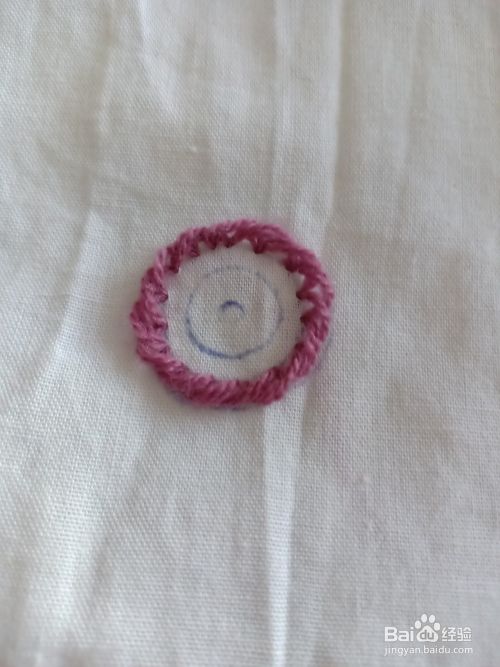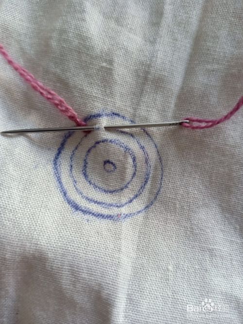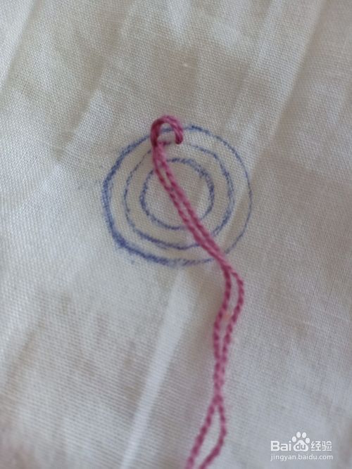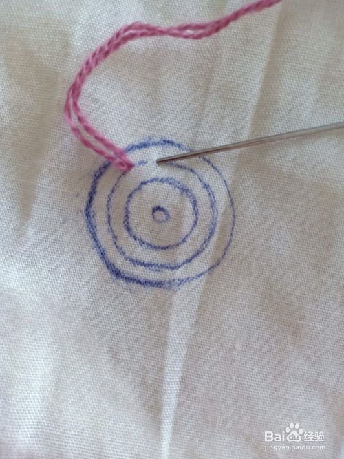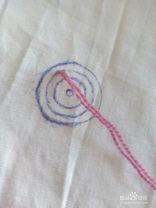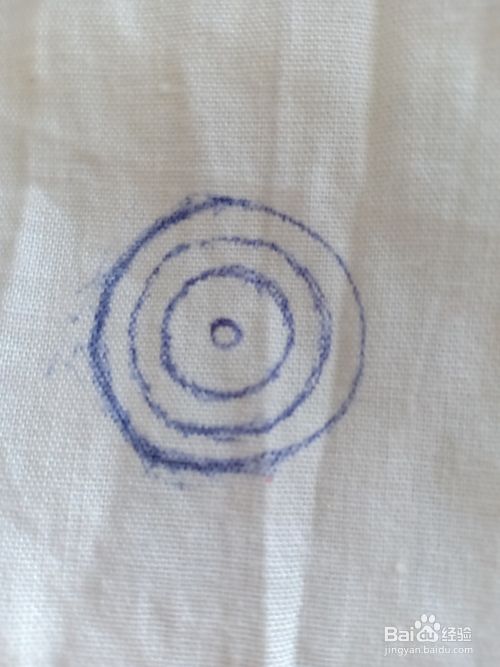 首先在布上画一个同心圆,然后在第二圈的辅助线上出针。