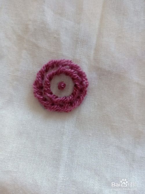 接下来按照同样的方法,绣制第二圈。绣完第二圈后,在中心点入针,绣一个“法国结粒绣”,一朵绣制简单的小花就完成了。