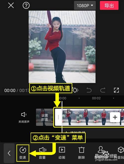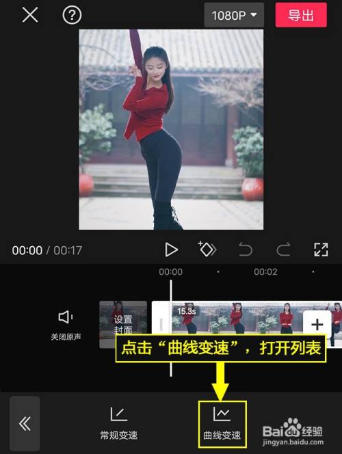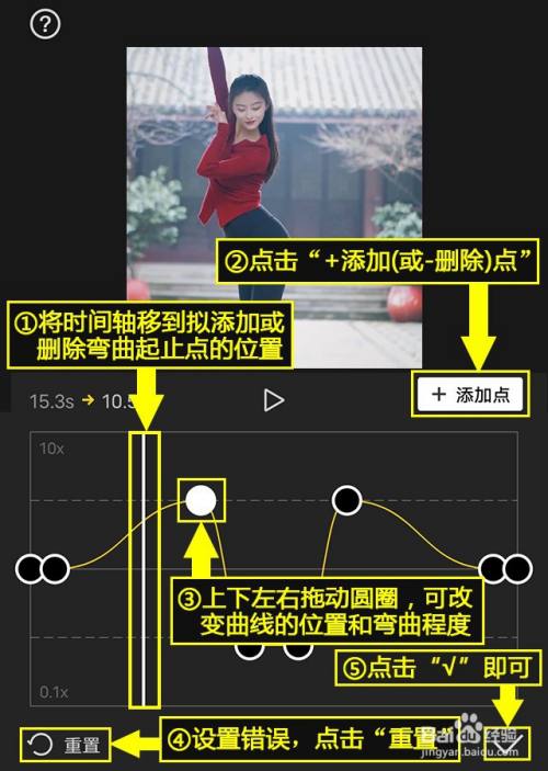 设置变速。将时间轴移到拟添加或删除弯曲起止点的位置,点击“+添加(或-删除)点”,上下左右拖动圆圈,可改变曲线的位置和弯曲程度,设置错误,点击“重置”,最后,点击右下角的“√”即可。