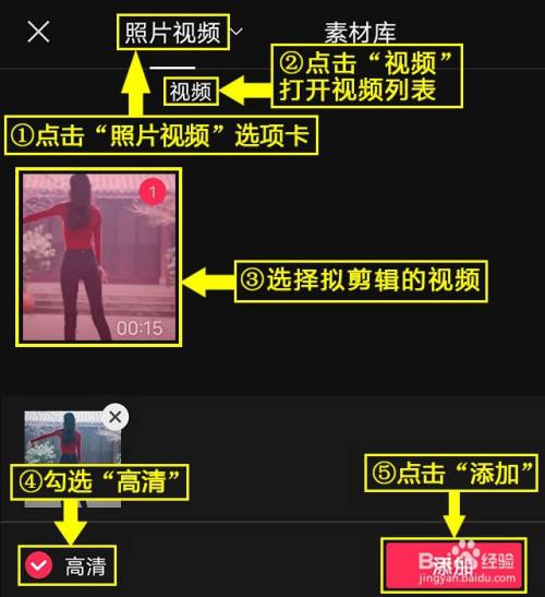 导入视频。点击“照片视频”选项卡,点击“视频”,打开视频列表,选择拟剪辑的视频,勾选“高清”,点击“添加”,导入视频。