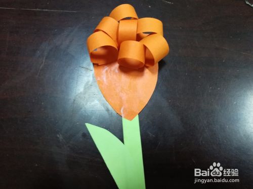最后一步就是把小圆圈粘到花朵上去。在橙色椭圆上涂满固体胶,然后把小圆圈依次不规则的摆放上去固定即可,然后等胶水晾干纸张变硬就能拿起来了。