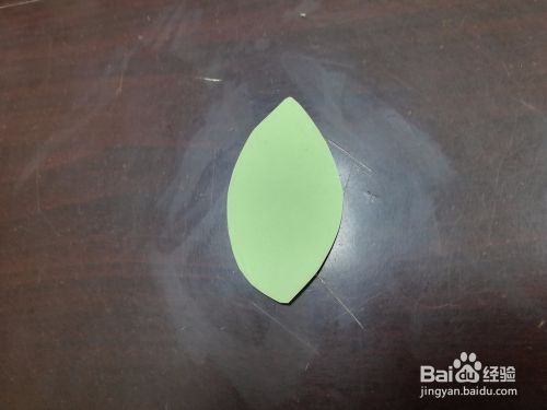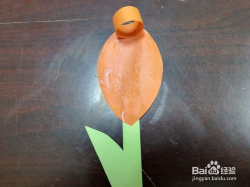 在另一半纸张上再裁出一个椭圆形,比第一个椭圆形稍微小点,把该椭圆竖着对折,跟上一步的长纸条如图用固体胶粘在一起,然后将第一个椭圆粘在长纸条的上端,花朵的基本轮廓弄好了。