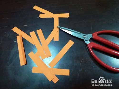将剩下的橙色长方形纸对折,用剪刀从外向折合处把纸张剪成一条条宽度差不多的小纸条。