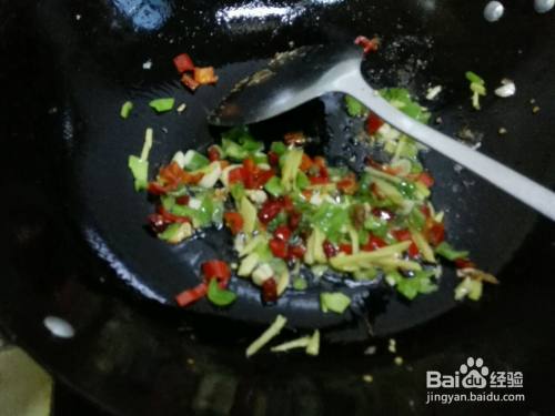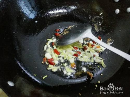 锅內余油下入姜蒜葱白段干辣椒煸香。