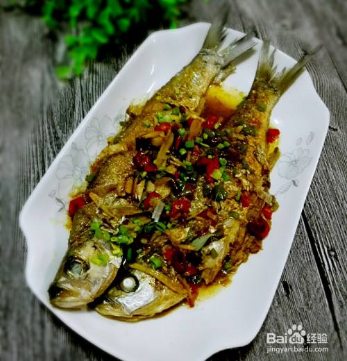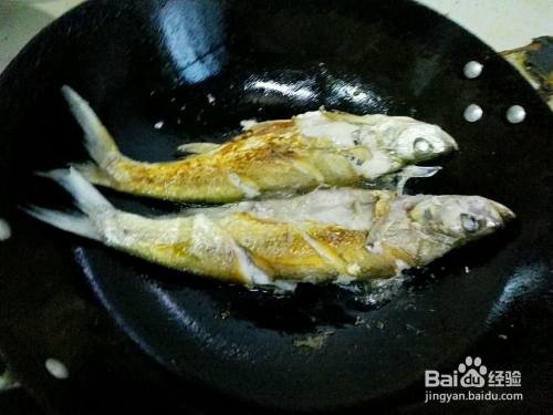 锅烧热,放两勺油,将晾干水的鱼(鱼要拣去佐料充分晾干水,不然易碎)下入煎制,中小火煎,随时转动锅子,让鱼受热均匀,防止煎糊。一面煎好再换一面煎,直至两面煎得金黄酥脆盛出。