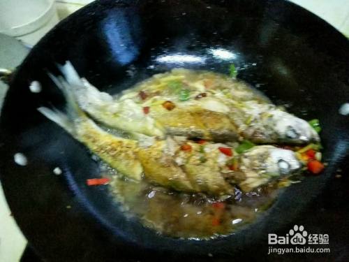 下入鱼,加适量清水(水至鱼身的一半即可)老抽,料酒烧开,把鱼轻轻铲动,防止沾锅,并用锅铲把汤汁不断浇到鱼没有沾汤的部位,同时尝下咸淡是否加盐(鱼腌制时加多盐的可以不加),加适量生抽、醋和少许白糖,见鱼差不多焖透,大火收汁起锅,在鱼上面洒葱花点缀即可。