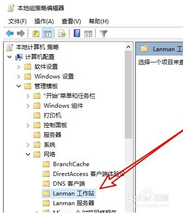 在打开的本地组策略编辑器窗口中定位到“计算机配置/管理模板/网络/lanman工作站”的菜单项。