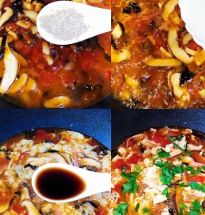 锅中油热放西红柿翻炒出浓汁,加2碗热水煮开,放木耳、豆腐、火腿丝、香菇丝煮开