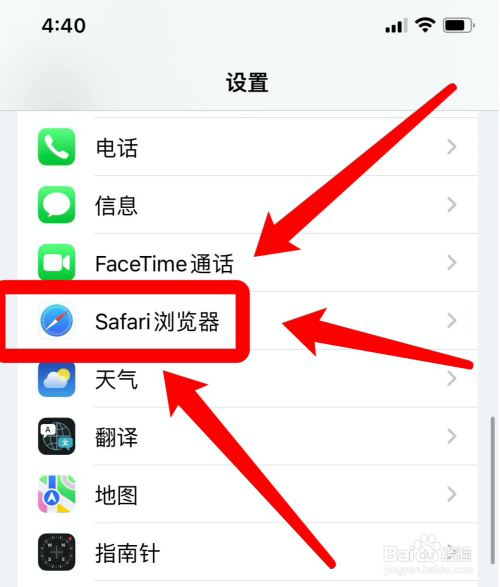 点开苹果手机设置,进入“Safari浏览器”设置界面。