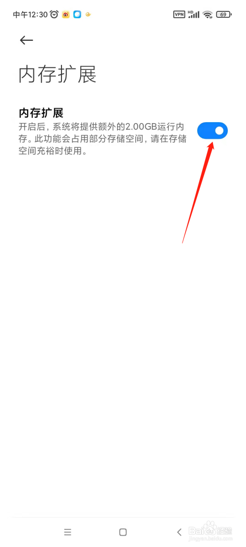 最后打开内存扩展开关就能够额外的增加2GB的虚拟运行内存啦。