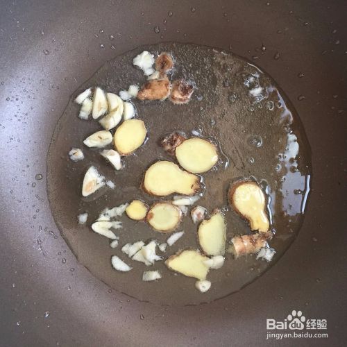 接着往锅中加入适量的食用油,生姜切片、蒜头切成蒜蓉发,倒进锅中爆香。