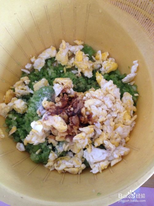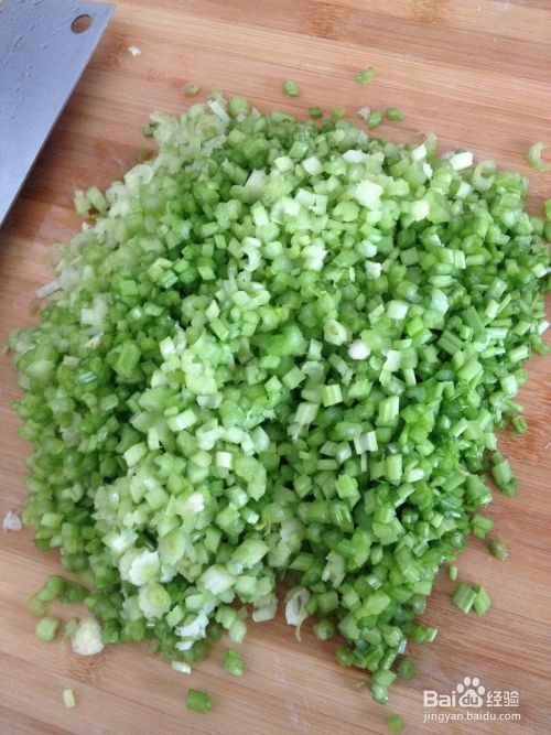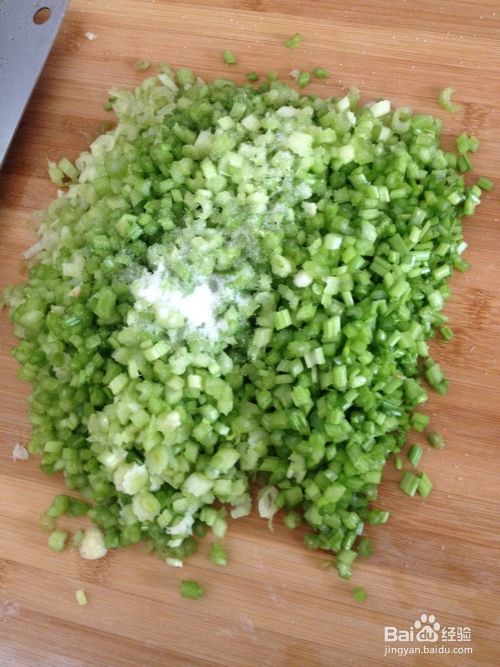 芹菜择叶洗净,切丁后撒少许盐剁成馅,(这样是为了让芹菜里的水分出来)