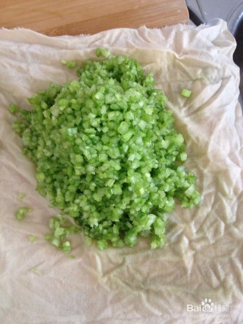 剁好的芹菜馅放到笼布中滤净多余的水分,倒入盆中。