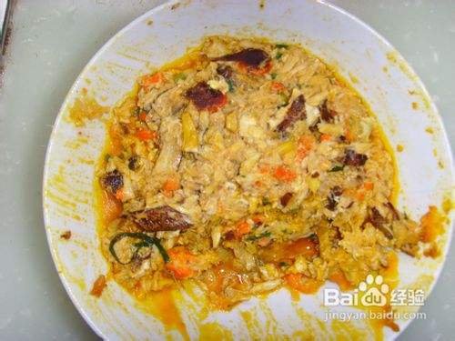 将螃蟹肉拆出,放入葱姜末在油锅中略微炒熟。备用。