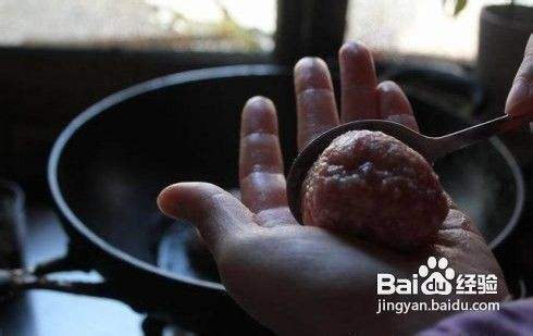 肉末如图,拿一个汤勺取一小团肉末,然后用汤勺和手反复翻动做成肉圆(汤勺和手都要弄湿,这样有利于成形)。